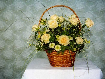 Зелень вся из горшков - папоротник адиантум ("пушистик" такой) и листья зефирантеса(длинные, тонкие). Только вот адиантум долго не стоит - 2 дня - и надо обновлять. Но, учитывая, какие он выдает заросли каждый год - это не страшно