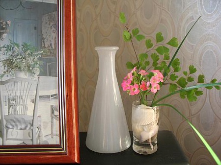 О! Хотела ее отрезать на фото - но поленилась... Рамочку подарили на свадьбу, формат оказался великоват, и она благополучно провалялась до приобретения ТЕХ САМЫХ вазочек. Потом была извлечена из недр шкафа, т.к. рядом с голубоватыми вазочками приспичило поставить что-нибудь голубое. Внутри - вырезка из какого-то журнала типа Seasons - чья-то красивая гостинная (или столовая?) в бело-голубых тонах с обалденным букетом на столе. Мне дико нравится. Такая романтичная и летняя картинка получилась. А свекровь каждый раз проходит мимо и сообщает, что "не понимает, в чем прикол", и что "надо это убрать"... Слава богу, это бывает не часто - раза 4 в год