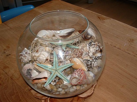 Вот такая композиция из ракушек. В обычный аквариум, насыпается песок чистый, речной, затем камушки, сверху ракушки, всевозможные жемчуга. Можно сверху, добавить шпагат завязаный морским узлом, или обвязать им аквариум. Если есть цветной песок, уложить слоями. Идей очень много.