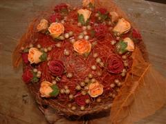 Вот другая композиция цветочная. Делается очень легко, нужны розочки искусственные, бусинки. Клубок большой ниток, обернуть каким- нибудь ворсистым материалом. Повтыкать розочки, нанизать на леску бусины и уложить их вокруг розочек. Самое интересное, эту композицию, можно сделать в любой цветовой гамме, подобрать по цвету розы и бусины. Красивое сочитание бело-розовое. У меня ближе к осени.