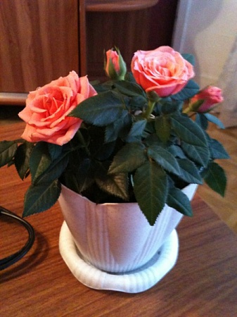 незнаю, я магазинного цветения не смогла добиться, розы по одному кусту, но у меня не мини, а обычные. Сейчас мне ими некогда заниматься, но они все в бутонах и цветах стоят, горшки маленькие стали, надо пересаживать. По Таниному (mirtosa) совету я им насыпала в горшки конского навоза и иногда удобрением поливаю кемирой. Бутоны с возрастом розы крупнее становятся. У меня сейчас розы взяли манеру цвести кучкой, как я красную показывала, так теперь жёлтая цветёт, из одного основания 5 бутонов и цветочков. Сейчас хочу посадить розочки в перегной с добавлением конского навоза, чуток добавлю, чтоб не сгорели совсем, а то с химией возиться не люблю.