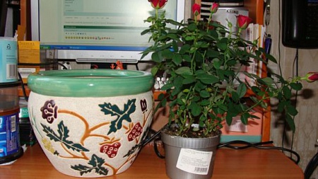 Купила три дня назад в "Зелёной стране" вот такую вот розочку голландского происхождения. Не пересаживала её и не переваливала, пока. Горшочек приобрела для неё, но пока она в нём стоит, как в кашпо. Опрыскиваю два раза в день. Стоит на компьютерном столе на кухне, т. к. стол находится у наиболее освещённого окна в квартире (северная сторона, в комнате совсем мрак, а ставить к другим цветам, на подоконник, пока опасаюсь, карантин...) На мой взгляд, розочка выглядит очень привлекательно. Вопрос: обязательно обрезать все бутоны и делать мыльную процедуру и промывку корней? Может можно ограничиться перевалкой, а бутоны оставить, как есть?