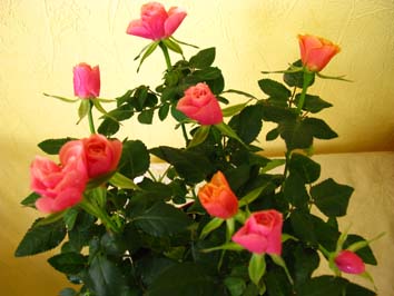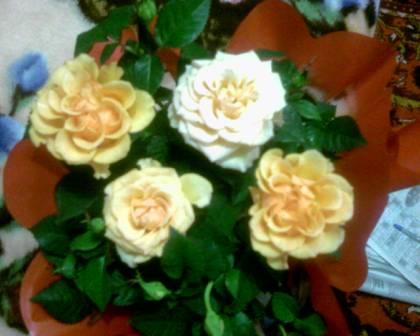 Всем привет!=) Вот прочла все добросовестно страницы,и решила вам рассказать свою историю. Хочу сразу отметить,что с комнатными цветами раньше дел не имела,у меня мама цветы разводит,но с розами не дружит потому у нас их никогда не было,кроме одной-китайская карликовая,которая пропала,а я же всегда любила розы,но не пробовала их разводить.И вот на это 8 марта,за дня два до моего приезда(мы живем в разных городах,но там так же есть мои родственники)мой молодой человек купил мне желтую мини розу,зная мою слабость к желтым розам.До моего приезда она была у него.Сначала всё было ок...но потом цветок явно начал пропадать,это было заметно невооруженным глазом.К моему приезду,а приехала я 8,она уже была в весьма плачевном состоянии.Пока я была там,я её попшикала и на ночь под пакет отправила,на утро ей стало лучше(даже бутон один раскрываться начал)но не на много,мы её повезли в магазин там где он её мне покупал,Чтобы нам сказали что же с розой.Продавцы нам сказали что мы её якобы заморозили,но на всякий пожарный дали лекарство в ампуле от вредителей(названия правда уже не помню)я её обработала и снова под пакет... А когда приехала домой это было десятое марта,поставила на пару дней на выбраное мной место,чтоб пришла в себя.Подоконники у нас узкие поэтому я поставила её на компьютерный стол.Моя комната с дочкой(у меня растет маленькая девочка=))очень светлая поэтому недоратка света нет,но в тоже время солнце не прямое,так что и полу-тень была обеспечена.В эти дни я её опшикивала родниковой водой,в перемешку с минеральной без газов(недалеко от нашего дома есть родник,поэтому водой из под крана водой мы не пользуемся)и один раз горячий душ ей устроила.Спустя несколько дней я решилась её пересадить-ей явно было тесно в горше,корни с отверстия были видны...в горшке было 4 кустика,и решила всё делать по полной программе...с промывкой корней...обрезала все бутоны,оставила только один,который распускался.Промыла корни с мылом,так как они мне не очень понравились-они не белые,но и не темные,основные с каким-то светлым бежевым оттенком был,а тонкие светло-коричневые,потом на каждом кустике от корня потемнения были,на трех это было больше похоже на древесину,а на том,на котором бутон был была чуть ли не черная.Не зная что делать,я сделала первое что пришло мне в голову-аккуратно сняла этот верхний слой на кустах под водой,под этими затемнениями ствол был светлый.Потом так как корни были не спутаны я разделила по два кустика и посадила.Один горшок поставила туда же где она раньше до пересадки стояла,а второй чуть выше на полку,и стала ждать.На следующий день бутон распустился-красота=)я им полюбовалась пару дней с срезала со старой листвой,чтобы быстрее в себя пришла,ещё Через пару дней полила слабым раствором кофе и эпином-почки стали просыпаться)Ещё Через три когда уже поливать надо было,полила не очень крепким раствором марганца,а буквально вчера в воду которой её опшикиваю добавила витамин д3-цветочек себя отлично чувствует,попробую фото разместить. Когда размещу может кто поможет мне?дело в том что я не знаю точного названия своей розы.Ходила в наш магазин,у нас такие розы тоже продают,спросила,а продавец сказала-просто роза. Благодарю за внимание,и буду рада услышать ваше мнение =)
