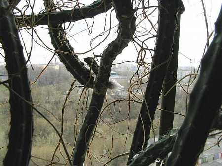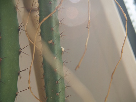 На материнском основном столбике- 4 грани, у отростка слева (длину отрастил уже 46 см)- 5 граней, воздушные корни, насчитала по 7 колючек в ареоле. Толщина около сантиметра (кроме плети,что справа, там вообще "стройная" ниточка-и не знаю, обрезать ее или оставить) фото по клику открывается: