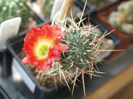[IMG WIDTH=384 HEIGHT=288][/IMG] из семян Меза Гарден 2002г. [IMG WIDTH=384 HEIGHT=288][/IMG] В левом верхнем углу Uebelmannia pectinifera var. multicostata 2002г. взошло 3 сеянца (пейрескиопсис- цереус), далее потеря растений (пожар на улице 2006г.- кактусы тогда были на лоджии, окна полопались от высокой температуры), как результат остался пенек, привитый на эхинопсис, который отводку, перепрививка на эхинопсис, 2014г.- на свои корни. В общем, сейчас можно купить растение и так не возиться. А данному растению до приличного вида еще очень далеко.