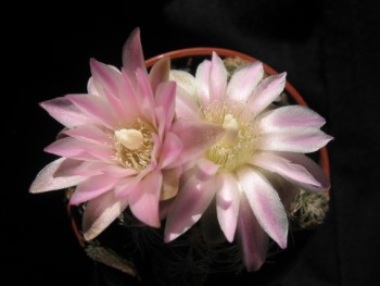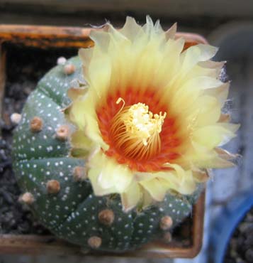 Я извиняюсь за качество, без вспышки совсем уж безобразно получилось. Любят они цвести, любят. Только моя семья их цветочки ромашками обзывает и совершенно не ценит. Да и я их не за цветение держу. Это гибрид CapAs (capricorne x asterias), диаметр цветка 5 см (кактус меньше). Возраст 4 года.