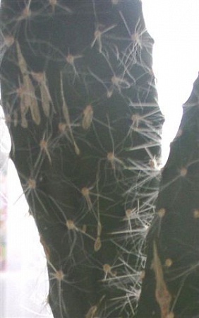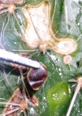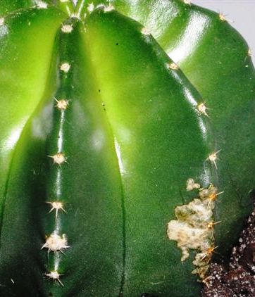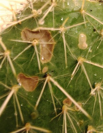 Этот кактус заболел год назад. Прошу обратить внимание не только на основные пятна, но и на ряд мелких пятен в нижней части растения, а так же на кольцевую „корочку“ вокруг верхнего левого лопуха