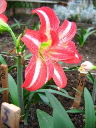 Высота растения – 37-40 см. Диаметр цветка – 18 см. 3-4 цветка. Цветок махровый, цветение среднее, около 24 дней. Доли околоцветника заостренные, края слабоволнистые, в центре цветка – три правильных укороченных стаминодия. Окраска цветка красная, с белой полосой по центральной жилке (на стаминодиях в виде лучей); зева – желто-зеленая, светлая.
