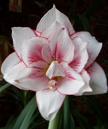 Высота растения – 50 см. Диаметр цветка – 13 см. 3-4 цветка. Цветок махровый, цветение позднее, обильное, около 27 дней. Доли околоцветника заостренные, края волнистые, загнуты назад. В центре цветка – три укороченных, слегка изогнутых, стаминодия. Окраска цветка белая с широкими светло-красными мазками и полосами по верхним краям лепестков. Края имеют красный кант с обеих сторон. Окраска зева – желто-зеленая, светлая, у основания – темно-красное кольцо
