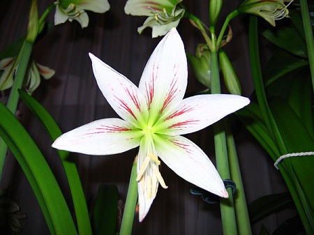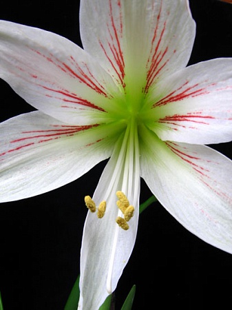 Первая лука из этой серии процвела по весне 2008 года, если кто помнит, алик дал ей определение(оно мне так нравится! ), как межлепестководырчатая, у этой же девочки такого не наблюдается.... Луковка, в соотношении с годами мелка(d=5см.), стрелка высотой 32см., бутонa 2,(стандартно-с завязью)-11,5см., цветы поникающие d=14,5см, с запахом лёгкой горчинки, лепестки узенькие, вишнёвые штришки, но больше всего его украшает зелёное горло, так же эта зелень повторяет продолжительность горлового узора на тычиночных нитях и пестике
