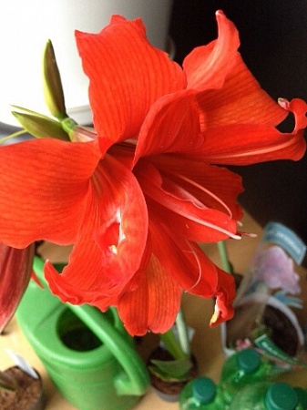 Ирэн, Amigo по описанию карминно-розовый, мой красный всё-же и лепестки у него отличаются по форме от моего... Lamisa, лучиками похож, но нижний лепесток действительно не такой, у Бамбары он побольше и форма немного не такая. На Ройяле посмотрю, вроде ничего нового не было... - вот здесь есть несколько подходящих красных, но по одному фото вывод же нельзя сделать. Луковицы были огромные (крупнее я не видела, даже лука Боготы из закупки, у которой многие отмечали значительные размеры, была меньше этих), я купила их на ярмарке весной, продавались россыпью, просто под фото без названия сорта. Цветы тоже были крупные - см. 18-20, без запаха, дали по три стрелки - выглядело со стороны, как будто в доме появилась огромная клумба. Подожду домашнее цветение, выложу здесь фото, посмотрим, что получится. Вот ещё фото - не получается фото нормально вставить, только ссылки