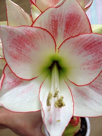 Кстати цветочек маленький, см 7 в диаметре, но я думаю потому что цвел в магазине, может поэтому и окрас такой. Сейчас на солнышко поставила, распускаются еще 4 бутона и ползет новая стрелка. Если окрас будет интенсивнее, то выложу фото. Очень уж интересно, что за зверь. Я как то выкладывала белый махровй гиппик, так первый цветок абсолютно не похож на 4ый. Если интересно выложу фото для сравения.