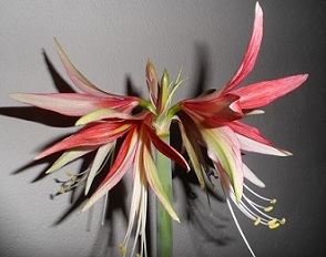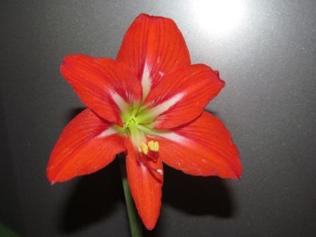 И я в опознавалки с неизвестным. Обещан был бордовый, но люди у нас зачастую названия цветов трактуют весьма вольно. Расцвело нечто тускло-красное, местами на лепестках слабые высветления, в которых нет никакой системы. Какой-либо запах отсутствует начисто. Размер цветка: примерно 6,5 см в профиль, чуть больше 11 см фас, если измерять через самые широкие лепестки - нижние боковые т.е. Особенности: периода покоя нет. Время от времени выгоняет листок или два, после чего (или одновременно) один-два старых отсушивает. Цветет у меня первый раз, выгнал две стрелы почти одновременно, на каждой по два цветка. Стрелки и чехлы зеленые. Интересно, что цветок раскрывает только ночью. То есть, в каком положении утро застало бутон, в точно таком он будет и вечером. А за ночь не только раскроется, но и успеет завернуть лепестки назад.