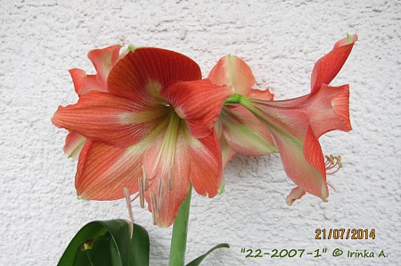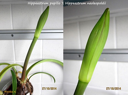 Общая высота растения(выступающая от поверхности земли) составляет 43см., высота стрелки 32см., длина листьев 34см., d луковицы 7см., бутоны перед распусканием нагнали-11см., цветки- по горизантали 10с., по вертикали 14см., без запаха.