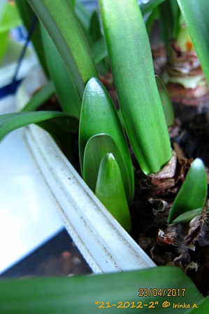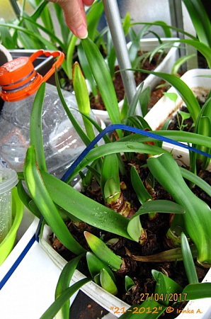 Как очередной тому пример. Сначала, ведро с этим кроссом я решила было выбросить, а не таскаться туда-сюда, и на балкон из теплицы не перенесла, так оно и продолжало болтаться, без пригляду, и поливу на столешнице.... Замаячил нос стрелки, думаю, раз сразу не выкинулось, так и быть, пусть остаётся, попробую распикирую в ящик на 80см., и пускай цветёт, если осилит Ну, а пока суть, да дело, когда дошло до пикировки, стрелка набрала высоту см 15., и с другого боку плошки показался нос второй. Тревожить не стала, просто пролила хорошенько Актарой, но всё же, Помощники опередили, сделав пометки "в проф не пригодности сеянца"