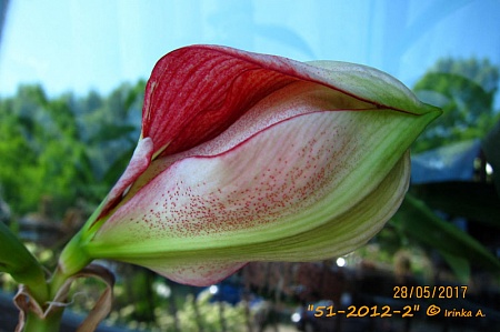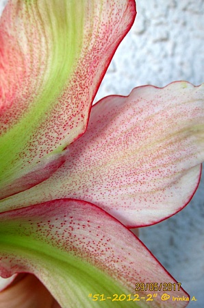 Очень симпатичный! Зелёнушки по краю лепестов, конопушки, а уж изнанка - как обёртка от конфет. Может со временем возмужает, исправится?