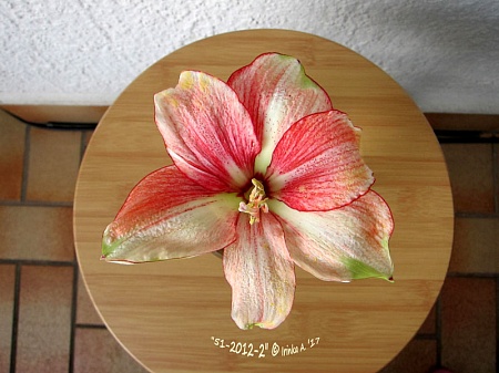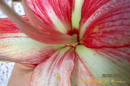 цветок d=17см. по вертикали-19см., запаха не наблюдаю, только сейчас начинает первый пыльник раскрываться.....