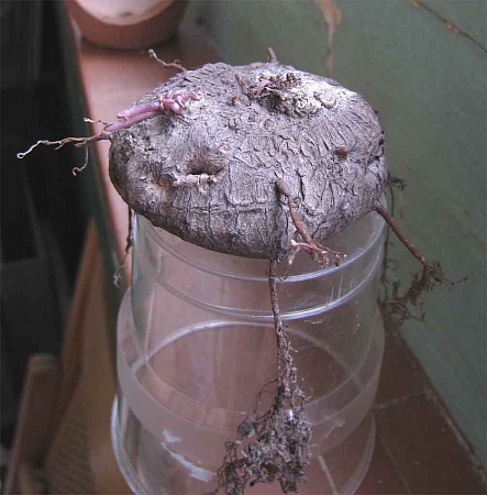 Как-то я уже обращался сюда за поддержкой и советом про свой циклмен... Был куплен клубень из пакетика на котором было написано "европейский". Но поскольку у торговки на базаре пакет был уже разован, там могло быть все что угодно... Клубень был закопан наполовину, потом полностью, потом откопан снова наполовину, но результат один - 1,5 года тишины и никаких листьев. Вчера откопал (думал, что он уже сгнил). А он весь в корешках и с какими-то "прыщами" на голове.... Сфотографировал и снова закопал с головой... Что же с ним делать? и что это за "прыщи" - листики пытаются вылезти или это опять корешки.