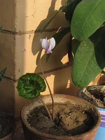 Помните я писал про свой цикламенчик, который опознали как неаполитнца и который 1,5 года вообще из земли не выглядывал, а потом процвел 3 цветочками без листьев. Так вот, теперь он выпустил 1 листик и снова 1 цветочек. И надо сказать, что с листиком цветочек смотрится лучше, чем без...
