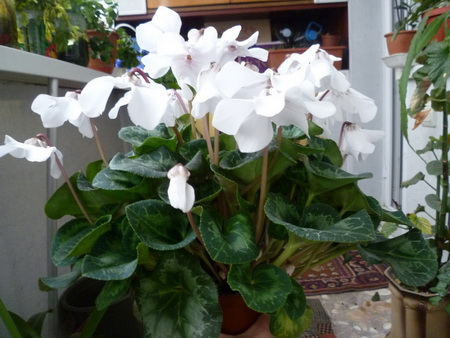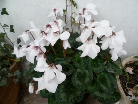 Приветик всем. Присоединяюсь к любителям цикламена И сразу о проблеме: купила недели полторы это прелестное чудо, цветущее. Пересадила сразу. Через дня 4 стали медленно желтеть листья. Осмотрела, вредителей вроде не видно. Когда купила цветы были не совсем белые, в каких-то веснушках и немного подсушены на краях. Новые растут белоснежные, здоровые, бутонов ооочень много под листьями, а вот листочки желтеют. Какие-то с серединки, какие-то с краев начинают. Вроде поливаю не много, как мне кажется, по краям горшочка. Горшок специально глиняный купила чтобы лишнюю воду впитывал. Признаюсь что после пересадки щедро полила цветок Клубень не трогала водой, только по краешку, полностью не закапывала, как нужно... не знаю что с ним(( помогите советами(( вот фото.