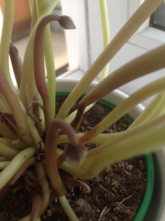 Добрый день! Как я рада что нашла этот сайт))) Цветами домашними не увлекалась , а неделю назад купила в ОБИ цикламен - белый - заворожил )))) Теперь люблю его))) Радость дарит. Сейчас цветут 3 цветка есть много бутонов, Но вчера заметила что один из цветущих красотулей как-то клонится стеблем вниз, посмотрела, а в основании он гниет или сохнет не понимаю((( Пожалуйста помогите вылечить его, в растениях вообще ничего не понимаю - новичок я)))