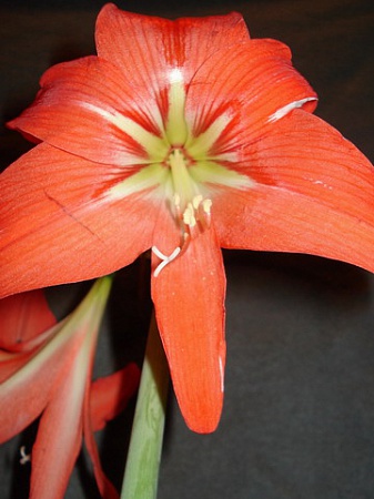 Вчера мы с Ириной К. ездили забирать свои луковицы из заказа , а потом немного "пошакалили" по цветочным магазинам в поисках ещё каких-нибудь гиппиков. Купили вот это и опознали его, как Hippeastrum striatum. Цветок немножко помят на фотографии, везти пришлось с распущенной стрелкой, пообтрепался, бедолага, в дороге . Даже цветонос поломался , пришлось "перебинтовать", чтобы было представление, как он выглядел первоначально. Знатоки, скажите , мы правильно его определили, или это что-то другое?