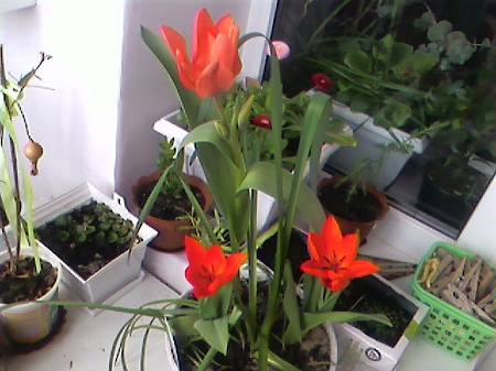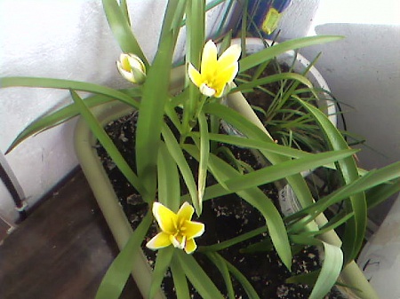 Ой забыла похвастаться. Тюльпаны Торнадо и желтенькие ботаники. Но самое удивительное, что ботаников садила в один горшок 4 сорта. Так поздние зацвели раньше всех. Вот это они и есть.Сейчас готовится урумийский ,наскальный и многоцветный.