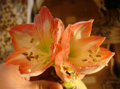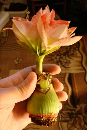 Сегодня у меня зацвела голландская луковица гиппеаструма неопределенного. Это та луковица, у которой пришлось вырезать почти половину донышка, т.к. оно прогнило. Уже несколько месяцев стоит на укоренении, но ни каких намеков на корни нет.