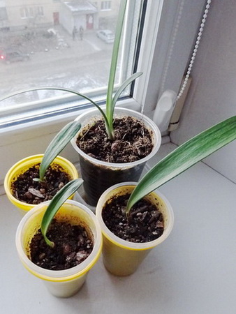 Вот мои сеянцы кливий, в большом стакане робуста, проросло семечко в марте. Была ещё "утка мандринка,она пропала, залила летом. От огорчения в августе заказала ещё три штуки. Оранжевую мультипетал, персикового и лососевого цвета, только когда зацветут...так долго ждать! Почва "для кактусов"+ "для сенполий"+ перлит+песок. Подкармливаю через полив, начинала жидким удобрением для декоративно-лиственных "Форте" ,теперь "Буцефалом"(раствор конского навоза). Буцефал похоже, понравился больше, так зазеленели сразу и подросли! Вечером решила подсвечивать настольной лампой.
