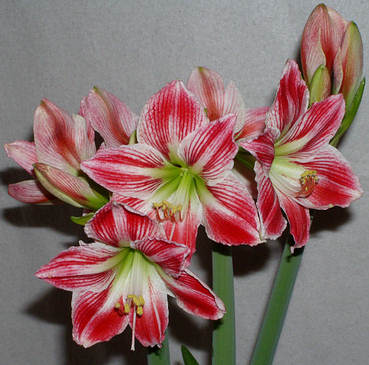 А у меня расцвел вот такой "Кот в мешке" - покупался как красный однотонный, и картинка прилагалась! Две стрелы, 10 цветков (6 + 4).
