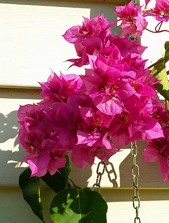 Купленные по весне маленькими черенками бугенвиллии летом на солнышке раскрыли свои первые цветы.