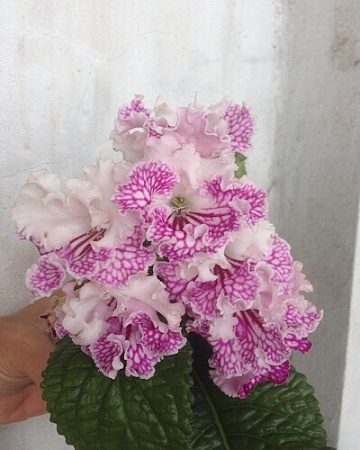 Dem-Шармель. Волнистые белые цветы с розовой сеткой, аккуратная розетка и букетное цветение.