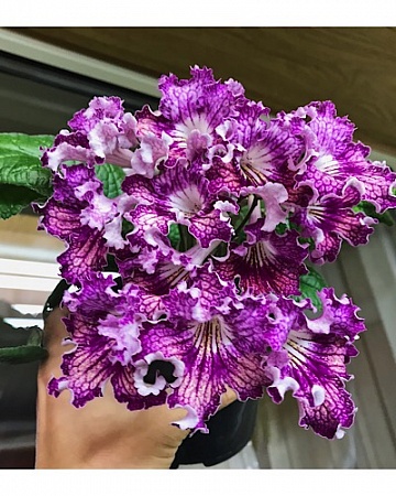 Среднего размера, темно-фиолетовые цветы с контрастной сеткой и яркими горлом. Обильное цветение, до 8 бутонов на цветоносе. Стадного размера розетка.