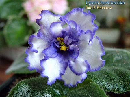 - белоснежный цветок с едва заметными голубыми тенями и синей каёмочкой по краям лепестков. Это первое цветение молодой розеточки