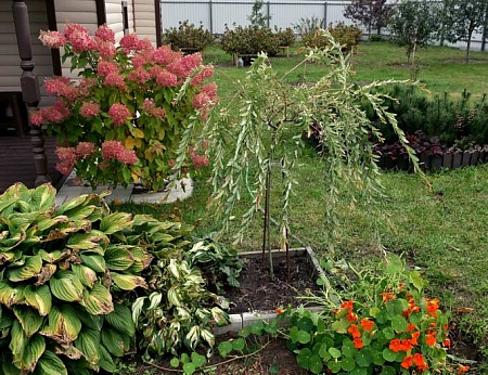 А потом приехала коллега по работе и по совместительству подруга. Я ей пообещала флоксов нарубить и хризантем накопать. Я то накопала... Но и мне в подарок была привезена целая ива. Хакуро-Нишики . Ага... Долго потом бегала по участку не зная куда её приспособить. Не нашла ничего лучше, чем впихнуть в рабатку с хостами. При этом попутно выдернув два куста хост, чтобы освободить место. Вписалась ива вроде неплохо. Но тут же встал вопрос - куда девать два кустища хост? О боже...