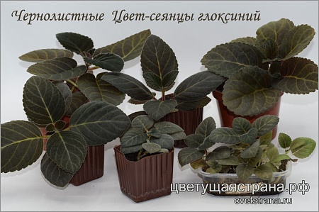 Обратите внимание: на одном фото ниже изнанка листа такого же свекольного цвета как цветок. Это сеянец. На втором фото чернолистные Цвет-сеянцы глоксиний. В прозрачном контейнере (на фото справа внизу) посев 'Цвет-Наташа х Цвет-Голубика+Цвет-Роза Аргентины+Цвет-Лиличка'