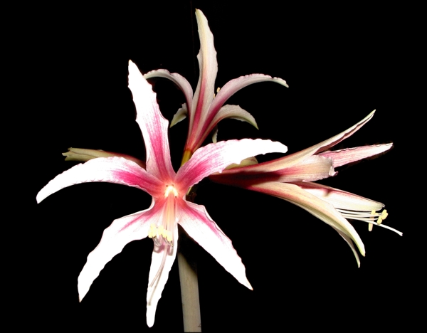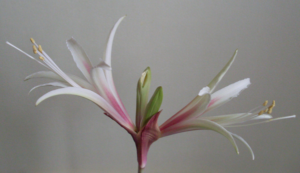 Цветок кремово-белого цвета, от центра каждого лепестка до его середины идут малиновые полосы, лепестки узкие, волнистые.