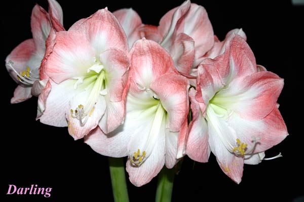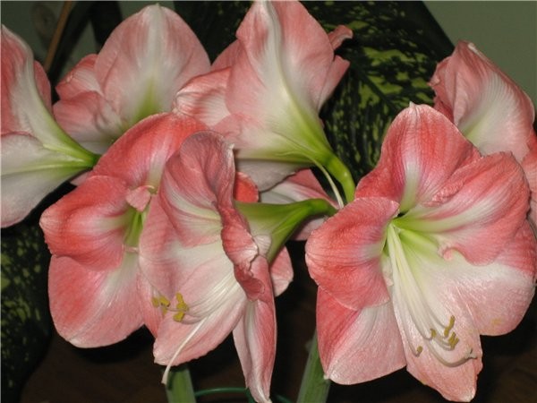 Цветки бледно-розовые с белыми мазками по середине лепестков. Горло светло-зеленое, тычиночные нити и пестик белые ближе к горлу зеленоватые.