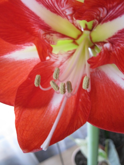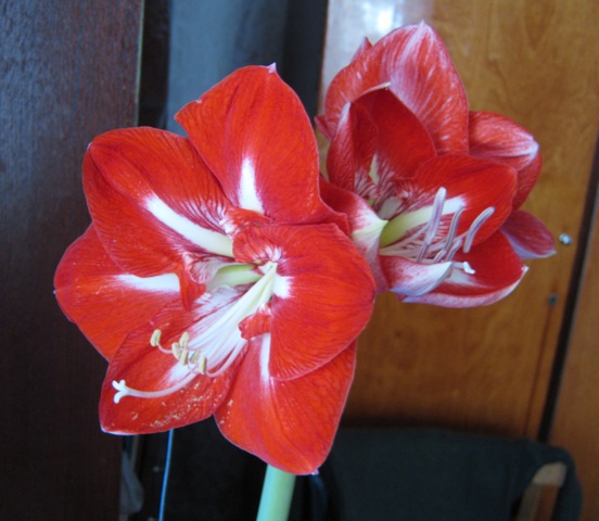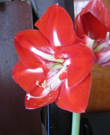 Цветы красные с широкой белой полосой, идущей из горла до середины лепестков. Вдоль полосы по краю лепестков небольшое жилкование. Лепестки имеют "рожки". В горле бордовый бит. Пестик белый со слабым розовым крапом около рыльца.